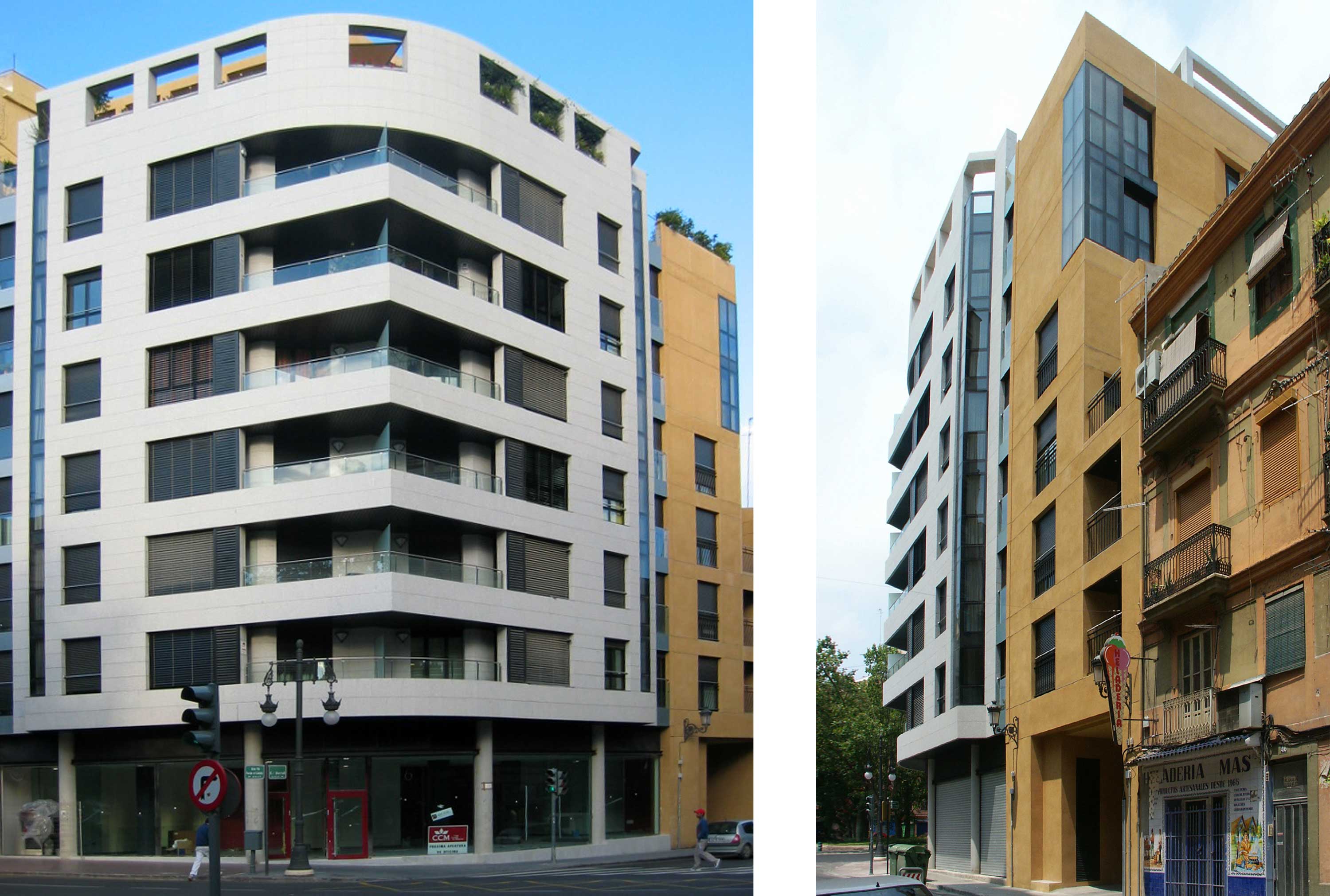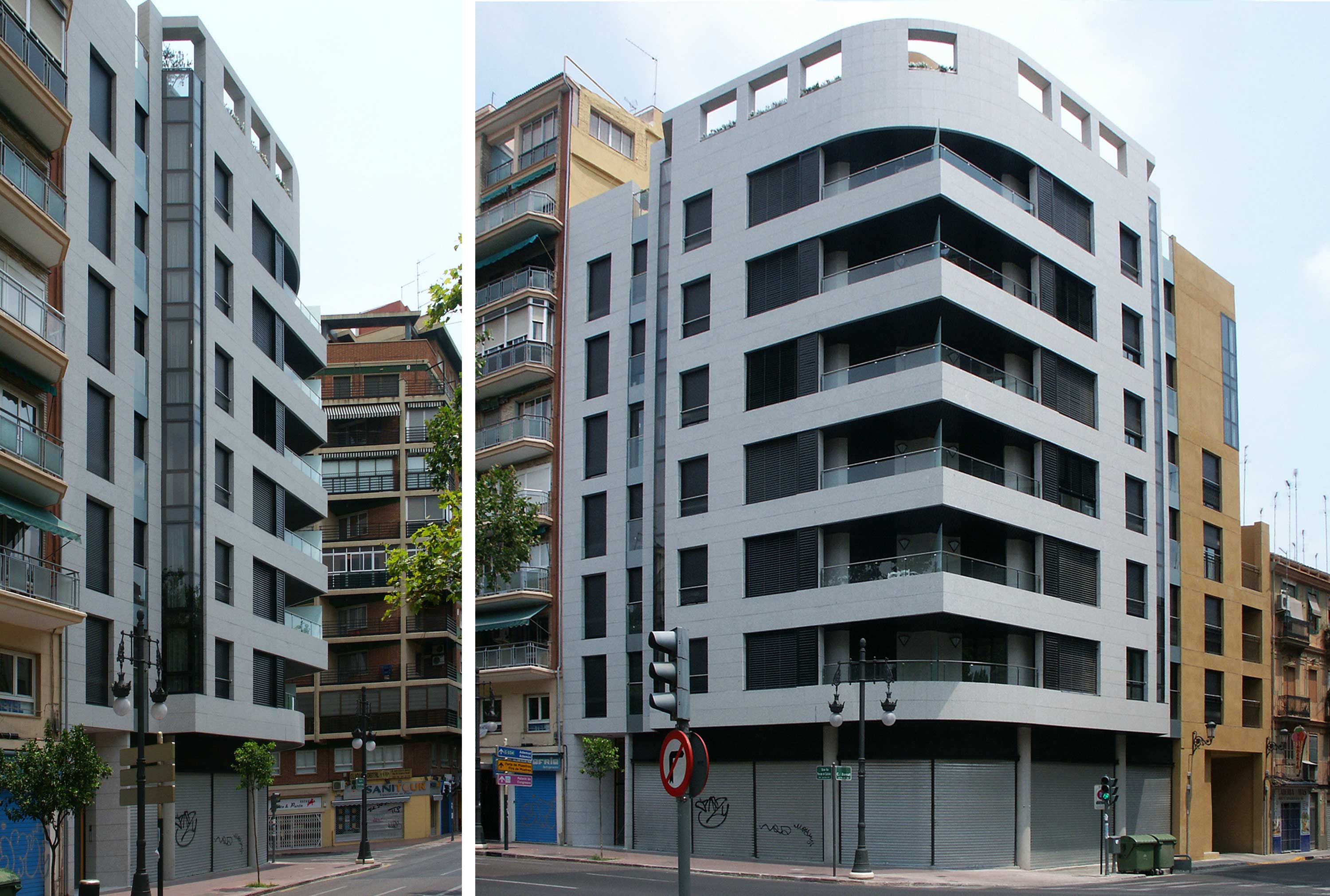 Su ubicación privilegiada en una esquina de la Gran Vía Fernando el Católico, una de las arterias de la ciudad de Valencia, con la calle Borrull es el germen esencial del proyecto. Su carácter de edificio en esquina se ve potenciado por la solución formal dual en arista y redondeado, generando un contraste que se impone a la vista. Por contrario, en su desarrollo hacia el centro histórico por la calle Borrull, cambia su aspecto, escalonándose y cambiando a un color más terroso, para integrarse suavemente con las edificaciones adyacentes en altura y gama cromática.