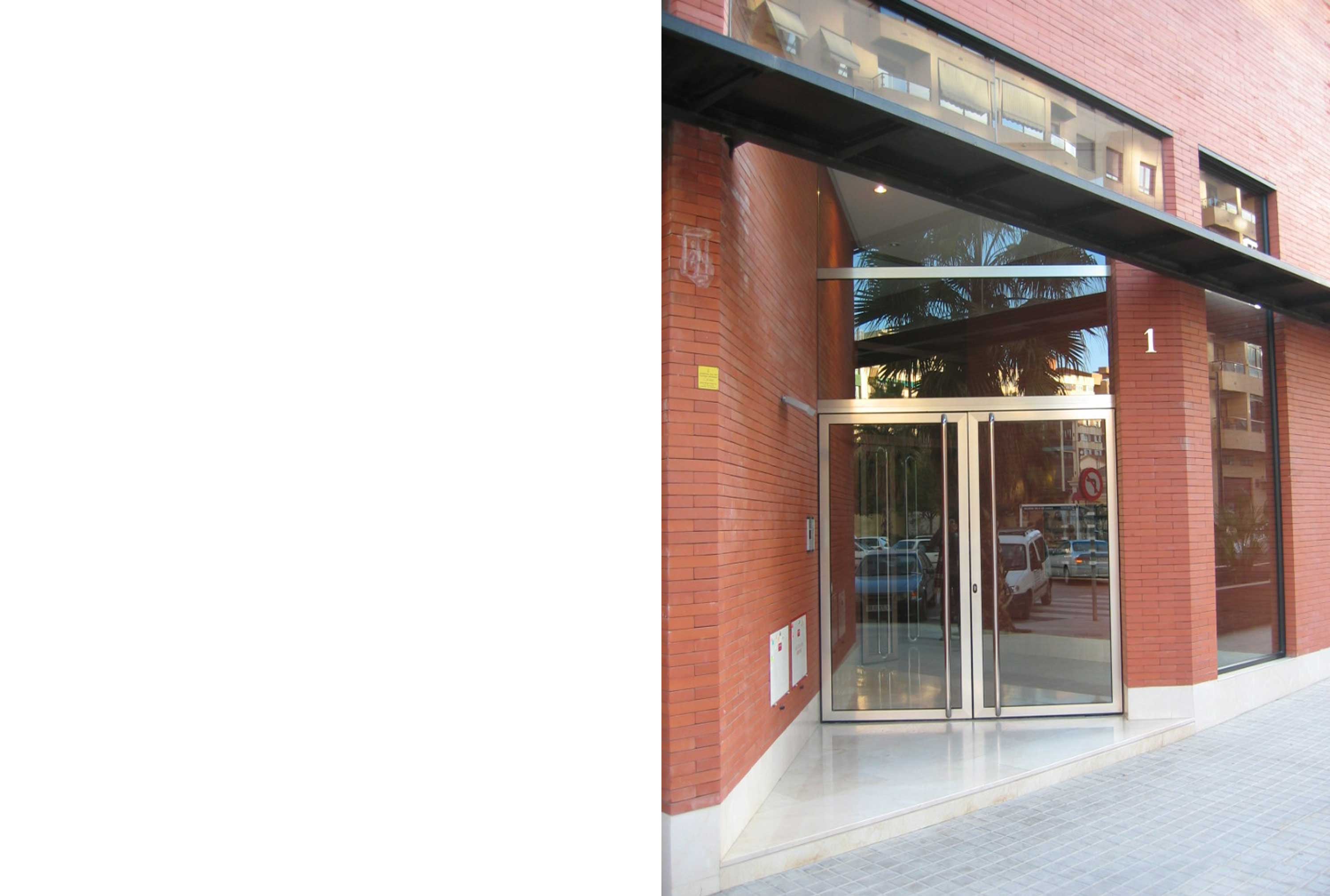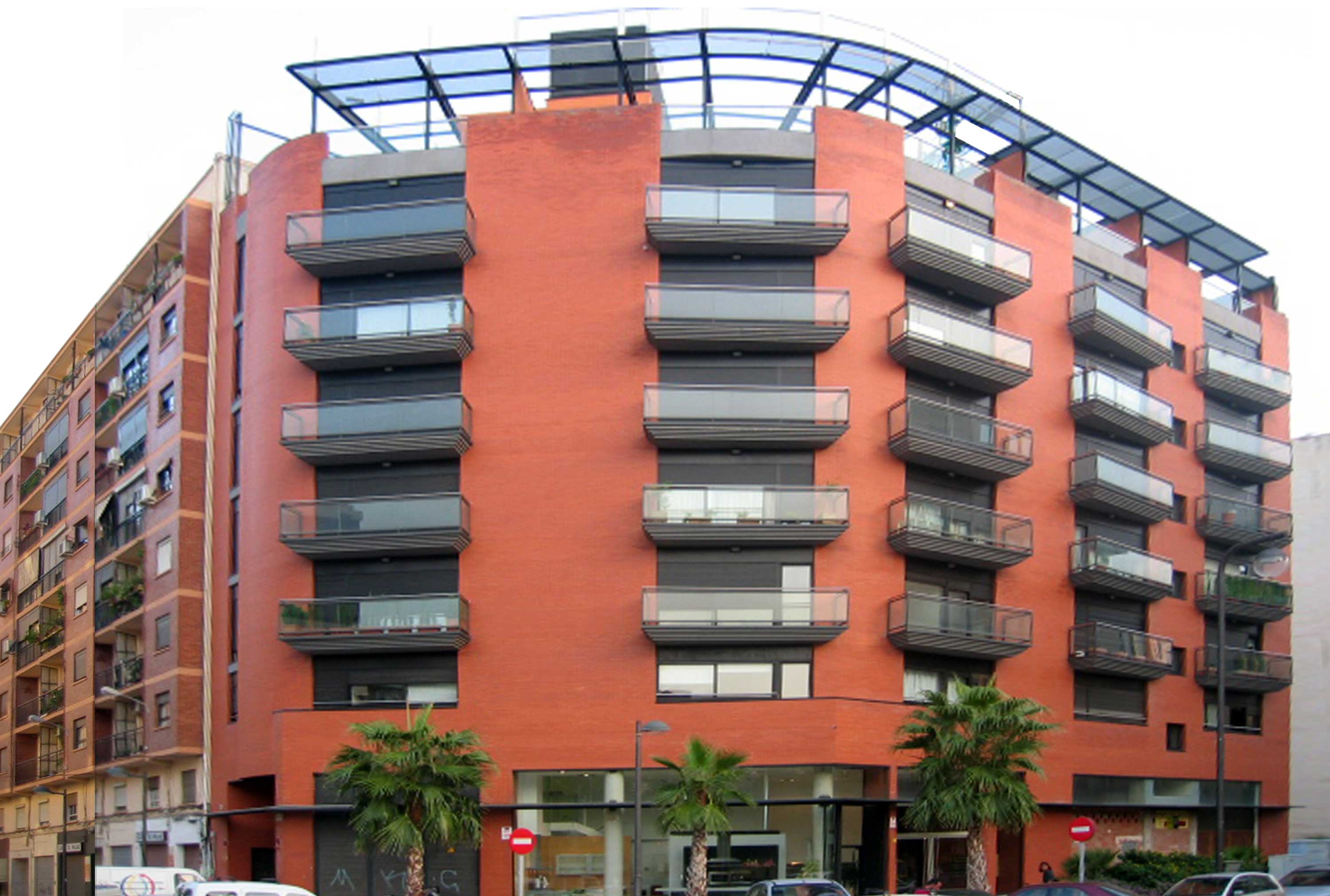 Este edificio residencial destaca por su cuidada estética gracias a la ejecución de su fachada con ladrillo caravista rojizo contrastando con las carpinterías y balcones en tonos oscuros. Su potente remate superior formado por una pérgola, también oscura, remarca la fachada e impone el edificio a su entorno inmediato.